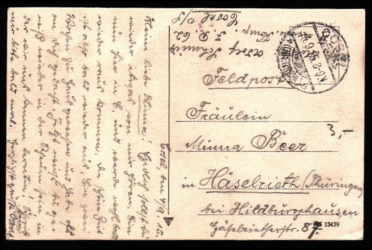 Skan najnowszej widokówki (strona na korenspondencję). Nadano ją 14 września 1915 roku w Koźlu. Nadawca podał adres poczty polowej 2 kompani rezerwowej 62 kozielskiego pułku piechoty.