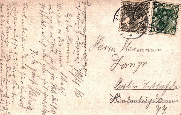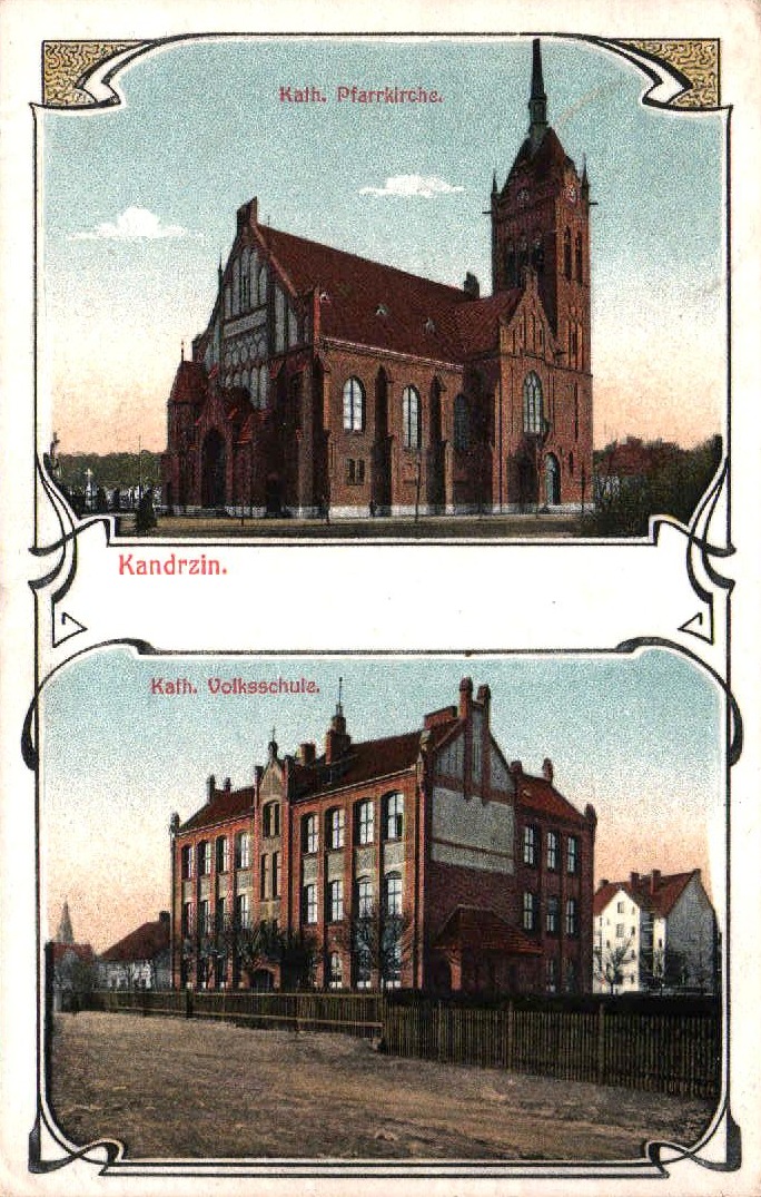 Pocztówka z widokiem kościoła katolickiego pod wezwaniem Świętego Mikołaja. w prawym dolnym rogu część korenspondencyjna tej pocztówki.