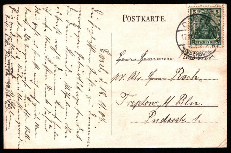 Korenspondencyjna strona kartki z widokiem rynku kozielskiego w stronę Oderstr. (dzisiejszej ulicy Anny). Kartka wysłana 18.11.1908 roku. Kartkę wydal Verlag von Arthur Radecker, Cosel O.S.