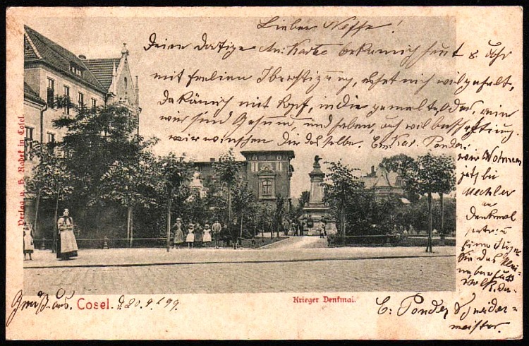 Kartka pocztowa wysłana z Koźla do Kozielawy (os. Starej Kuźni, gm. Bierawa) Fürstenberg. Kartkę tę wysłano w dniu 20.09.1899 roku. Wydrukował ją Verlag v. Hermann Radek i przedstawia ona pomnik wojenny w Koźlu.