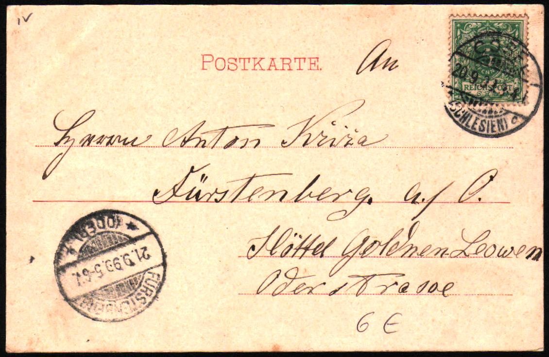 Kartka pocztowa (druga strona) wysłana z Koźla do Kozielawy (os. Starej Kuźni, gm. Bierawa) Fürstenberg. Kartkę tę wysłano w dniu 20.09.1899 roku. Wydrukował ją Verlag v. Hermann Radek i przedstawia ona pomnik wojenny w Koźlu.