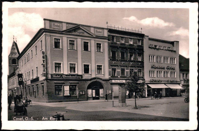 Kozielski Rynek - Hotel Kronprinz - nocował w nim syn cesarza niemieckiego i następca tronu. (pocztówka z 1939 roku)
