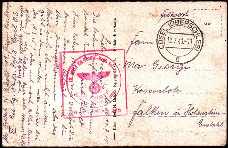 Wysłano ją z Koźla 12.7.1940 roku poczta polowa.