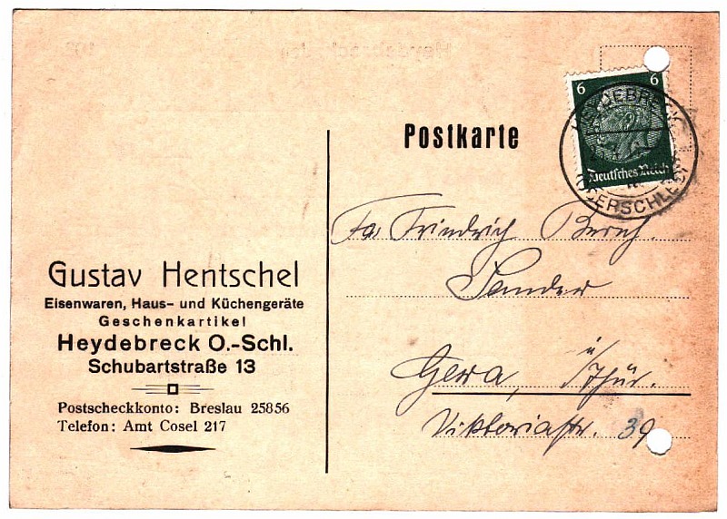 Skan kartki pocztowej firmy Gustava Hentschela z Kędzierzyna, kartka ta wysłana została 25 kwietnia 1936 roku do Gery.