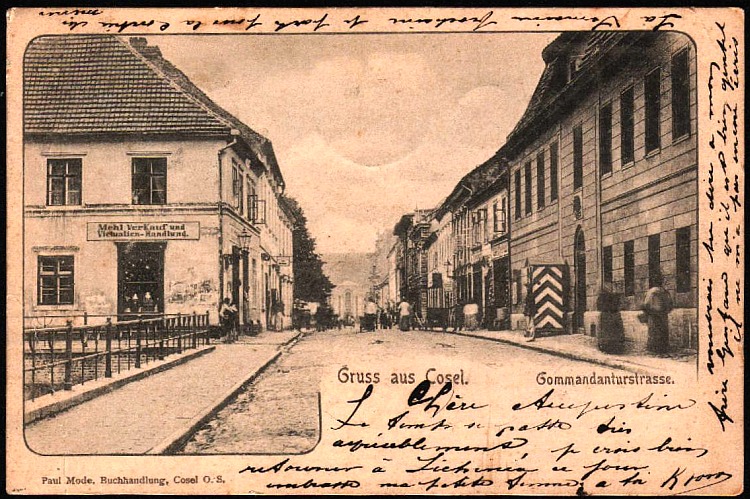 Stara pocztówka (widok z okolic kościoła p.w.św. Zygmunta i św. Jadwigi Śląskiej w kierunku rynku, w głębi widoczny kościół ewangelicki).