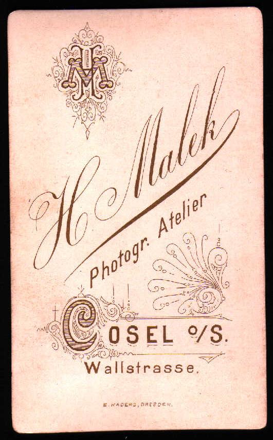 Portret wizytowy oficera kozielskiego garnizonu wykonany około roku 1890 w Atelier Malek. Strona odwrotna portretu z informacjami o atelier.