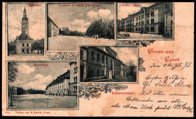 Pocztówka wysłana z Koźla 2.07.1898 roku. Przedstawia kozielski ratusz oraz zabudowania koszar. Obecnie to ulica Targowa. Ta i pocztówka ukazująca pomnik Neumana w licytacji na E-bay osiągnęły cenę ponad 60 euro.