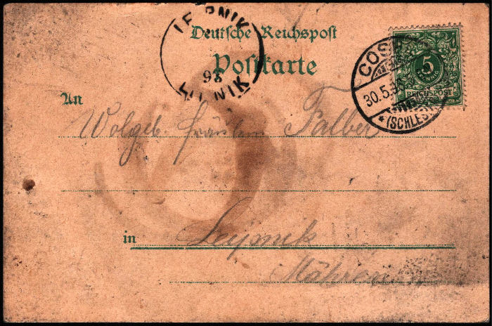Jedna z pierwszych kolorowanych widokówek kozielskich, wysłana została z KoĽla w dniu 30 maja 1898 roku, drukowała j± firma Kunst Anstalt Rosenblatt Frankfurt a/M.