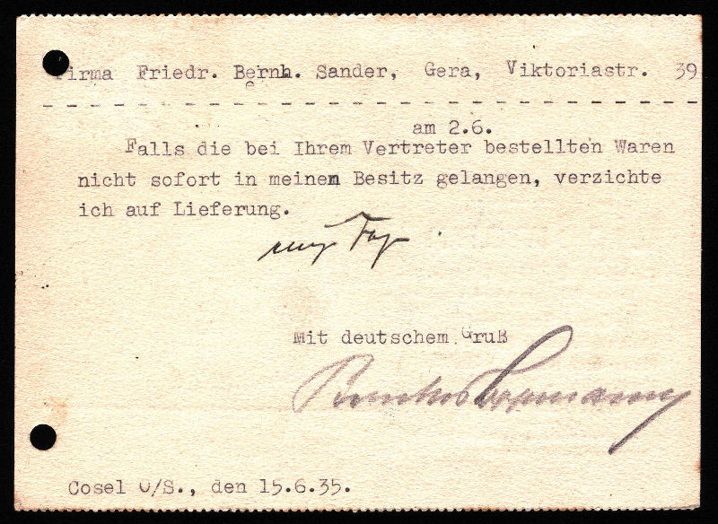 Skany kartki firmowej B.Lippann, w której wła¶ciciel sieci sklepów w KoĽlu i w Kędzierzynie - Bernhard Lippmann upomina się o towary zamówione w Gerze. Kartka stemplowana jest w dniu 15.06.1935 roku i wysłana z KoĽla do Gery.