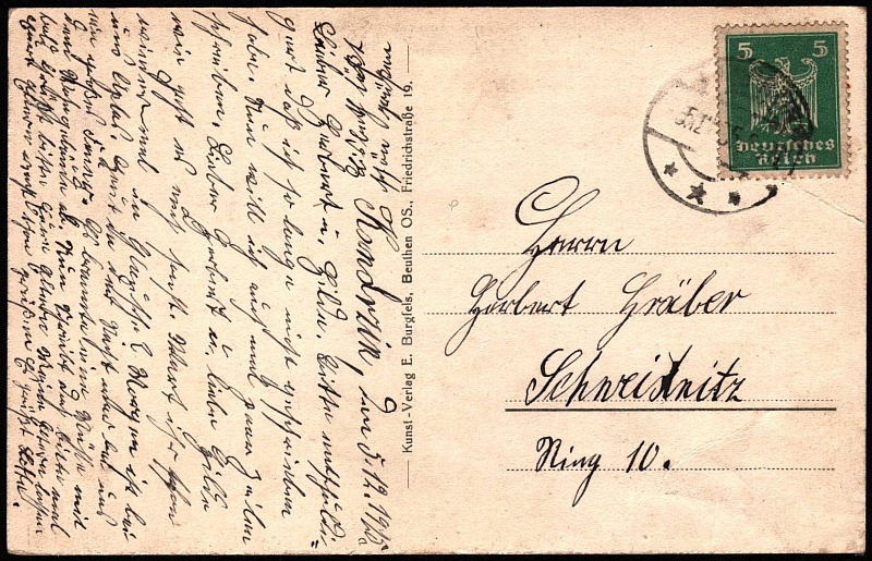 Kędzierzyn (data stempla 5.12.1925) ulica Głowackiego (dzi¶) z widokiem na ko¶ciół ewangelicki i sklepik z zak±skami Josefa Jochemczyka "VorKost Geschäft" i dalej "Central-Caffee"- kawiarnię i ciastkarnię. (strona na korenspondencję)