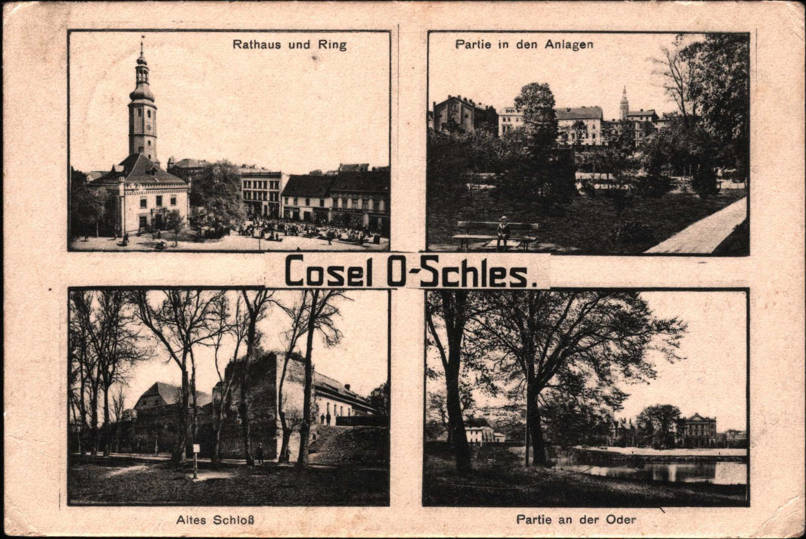 Pocztówka (4-widoki), przedstawiająca stare Koźle.