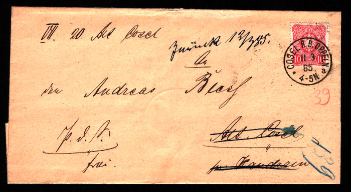 11.03.1885 roku wysłany z Koźla do adresata w Starym Koźlu