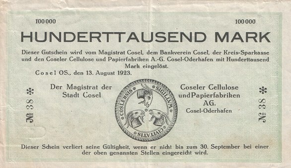 - pieniądz zastępczy z KOZIELSKIEJ FABRYKI PAPIERU o wartości 100