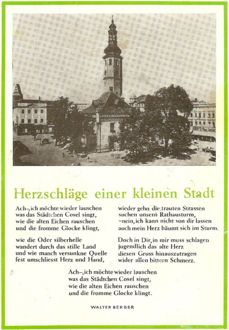 zdjęcie nadesłał Piotr Mierzejewski. Wolnego tłumaczenia wiersza dokonał Marek Jura Bicie serca małego miasta Ach, tak chciałbym znów posłuchać Miasta Koźla śpiewny ton Co wiatr w starych dębach szumi Jak brzmi kościelny dzwon Znowu iść przez twe ulice Na ratusza wieżę wejść Ja nie mogę Cię zapomnieć Ach szaleje serce me! Gdzie Odra srebrzysta Wędruje cichym Krajem Iluż ona źródłem wzruszeń ściskających mocno serce me i dłoń Mimo tak gorzkiego bólu Znów młodzieńcze serce rwie Ja pozdrawiam Cię serdecznie Ukochane Miasto me! Ach tak chciałbym znów posłuchać Miasta Koźla śpiewny ton Co wiatr w starych dębach szumi Jak brzmi kościelny dzwon Walter Berger |