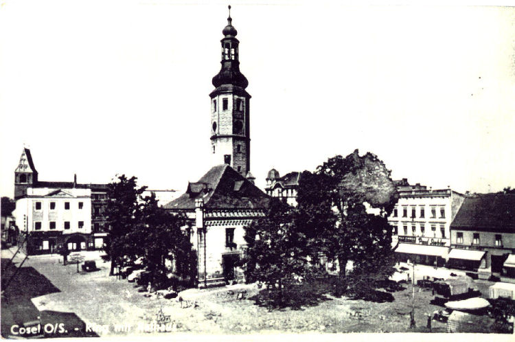 Widok na Ratusz na kozielskim rynku od strony obecnej ulicy Marii Curie