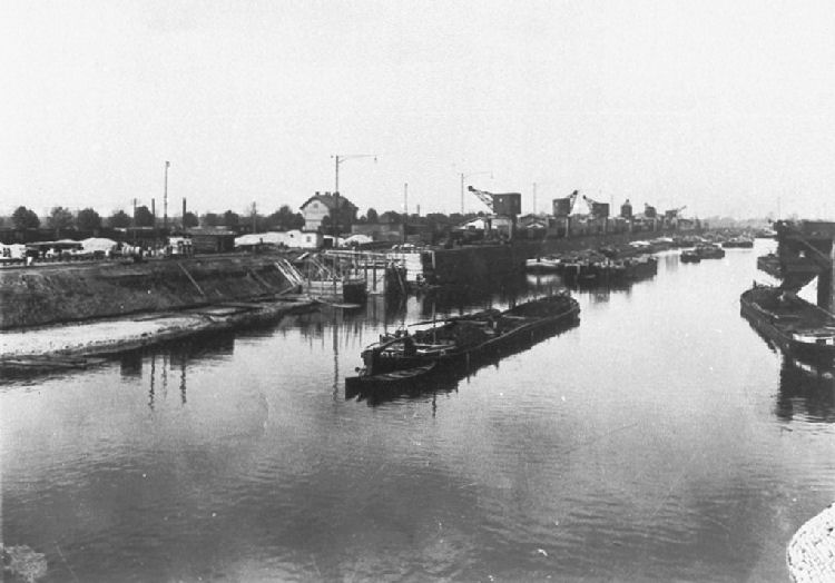 Widok na pierwszy basen kozielskiego portu w KoĽlu-Porcie ( z lewej widoczna budowa nabrzeża basenu) Umschlaghafen