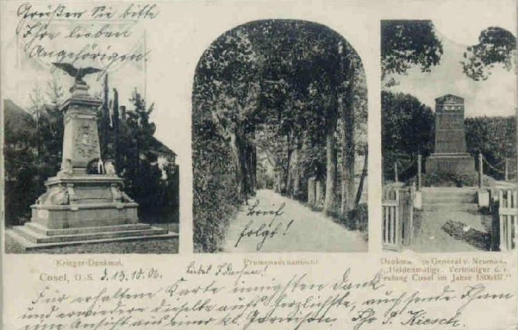Pocztówka z kozielskimi pomnikami, po lewej - pomnik ofiar wojen 1864,