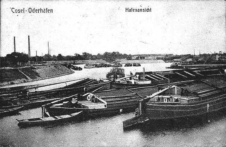 Barki na redzie kozielskiego portu. Oderhafen - Hafenansicht