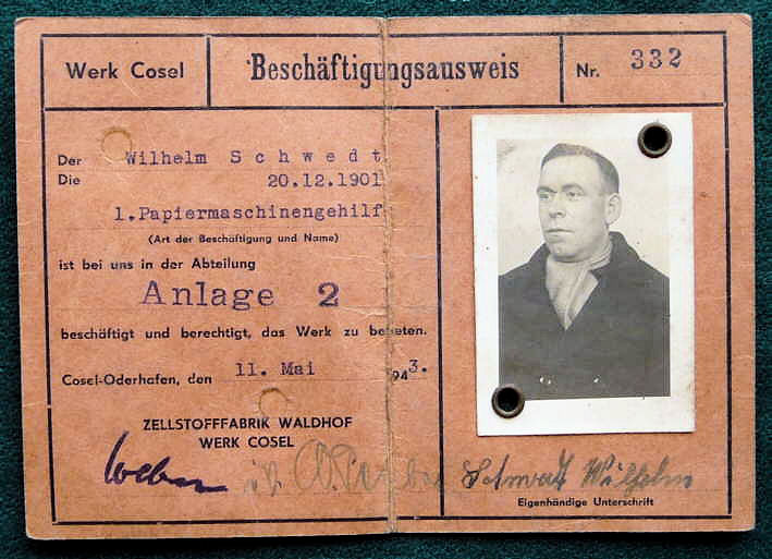 Dowód Zatrudnienia Cosel ( Koźle ) 1943, zakład produkcji papieru, niewielkie zabrudzenia.