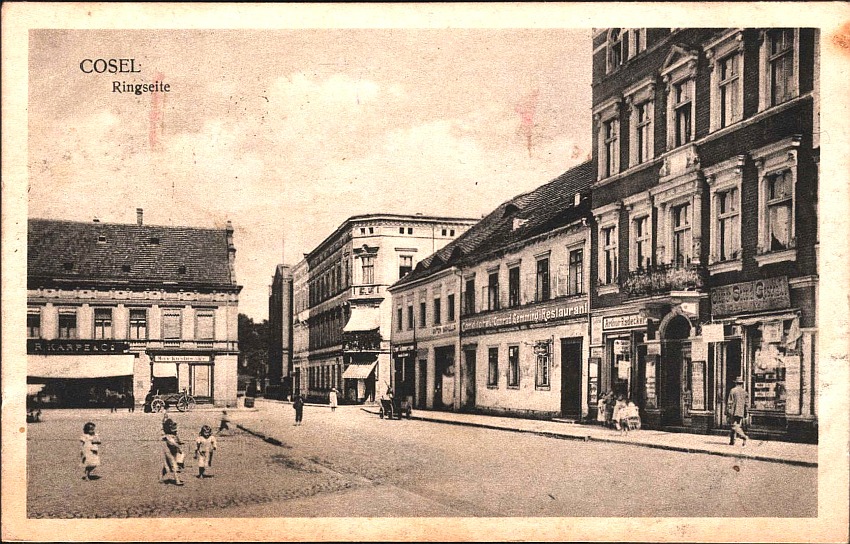 ![]() Kartka ta ma stempel na znaczku z datownikiem 28.8.1919. Widoczny jest na niej narożnik rynku kozielskiego ze sklepami i firmami takimi jak: Conditorei Restaurant Conrad Gemming,Arthur Radecker,Max Koslowsky i R.Karpe&Co. - nadesłał Marek Jura |