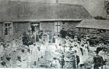 | Wierni zgromadzeni przed dawnym kościółkiem przy obecnej ulicy Krasińskiego. | |||||