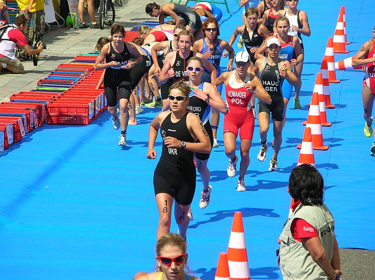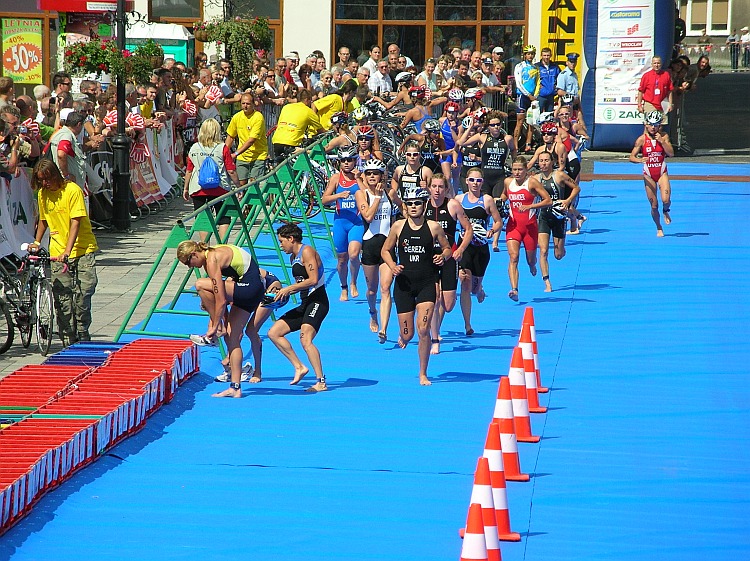 Panie dobiegają do rowerów po wyczerpującym pływaniu